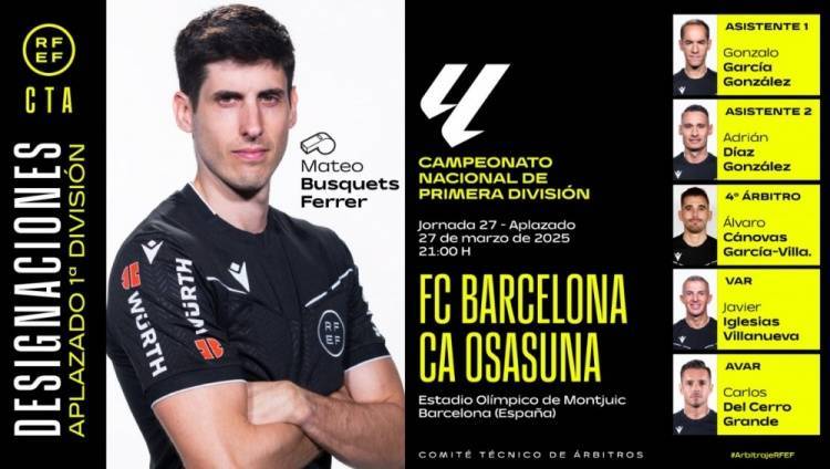 直播吧3月25日讯 北京时间3月28日凌晨4:00,2024-25赛季西甲第27轮补赛,巴塞罗那将迎战奥萨苏纳。赛前,西班牙足协官方公布了本场比赛裁判组,费雷尔执法。